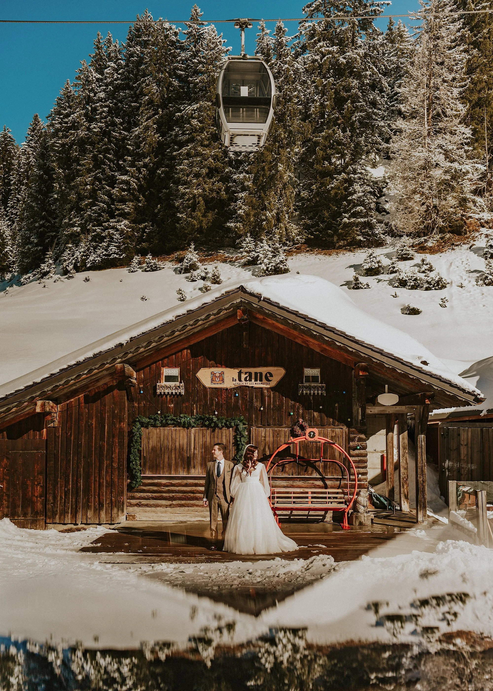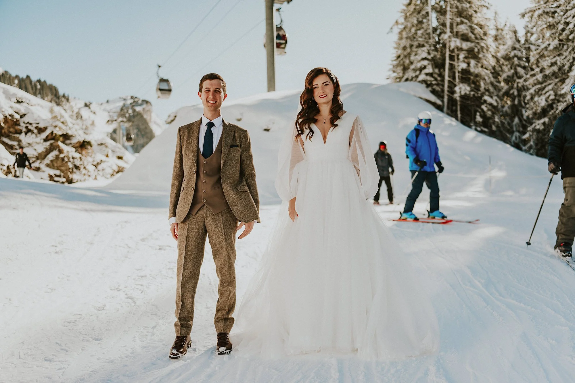 After all the getting ready feels it was first look time with French Alps backdrops before we headed up to the slopes in a Gondola amidst all the skiers. In all the years of doing this job I have never felt like I did during those moments it was just so damn spesh. In fact editing the images last night made me cry real life tears. Partly because it was so epic & partly because I was actually really poorly on the day after getting sinusitis from the kids. I put everything I had into making these Ski slope wedding photos & they are some of my all time favourites I've ever made. The celebrating skiers, the snow plows, the mountains & the beautiful humans at the centre of it all. What a privilege.